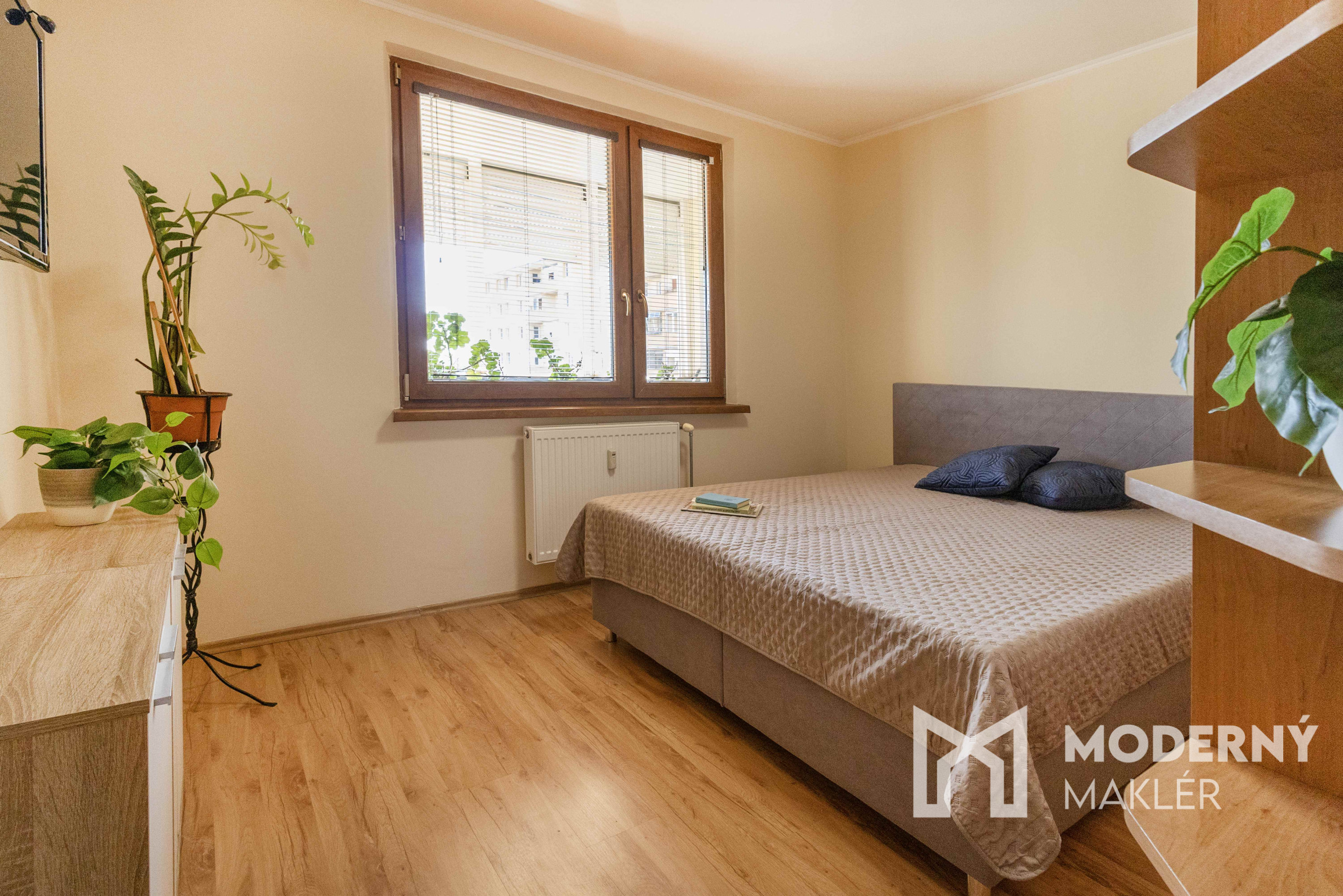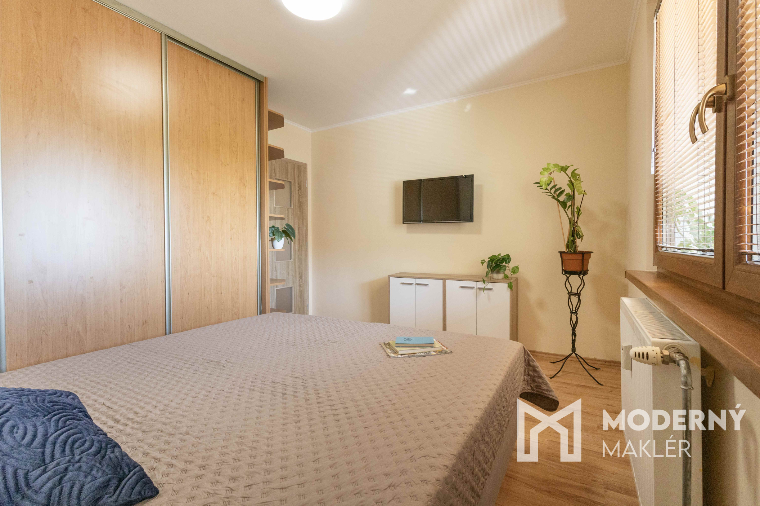 Nočná časť bytu tvorí veľká spálňa s manželskou posteľou, komodou, smart televízorom a zabudovaným šatníkom. Druhá izba je samostatná, vybavená kancelárskym stolom, kreslom, válendou, knižnicou a taktiež disponuje vstavaným šatníkom, čo ju robí ideálnou ako detskú izbu alebo pracovňu.